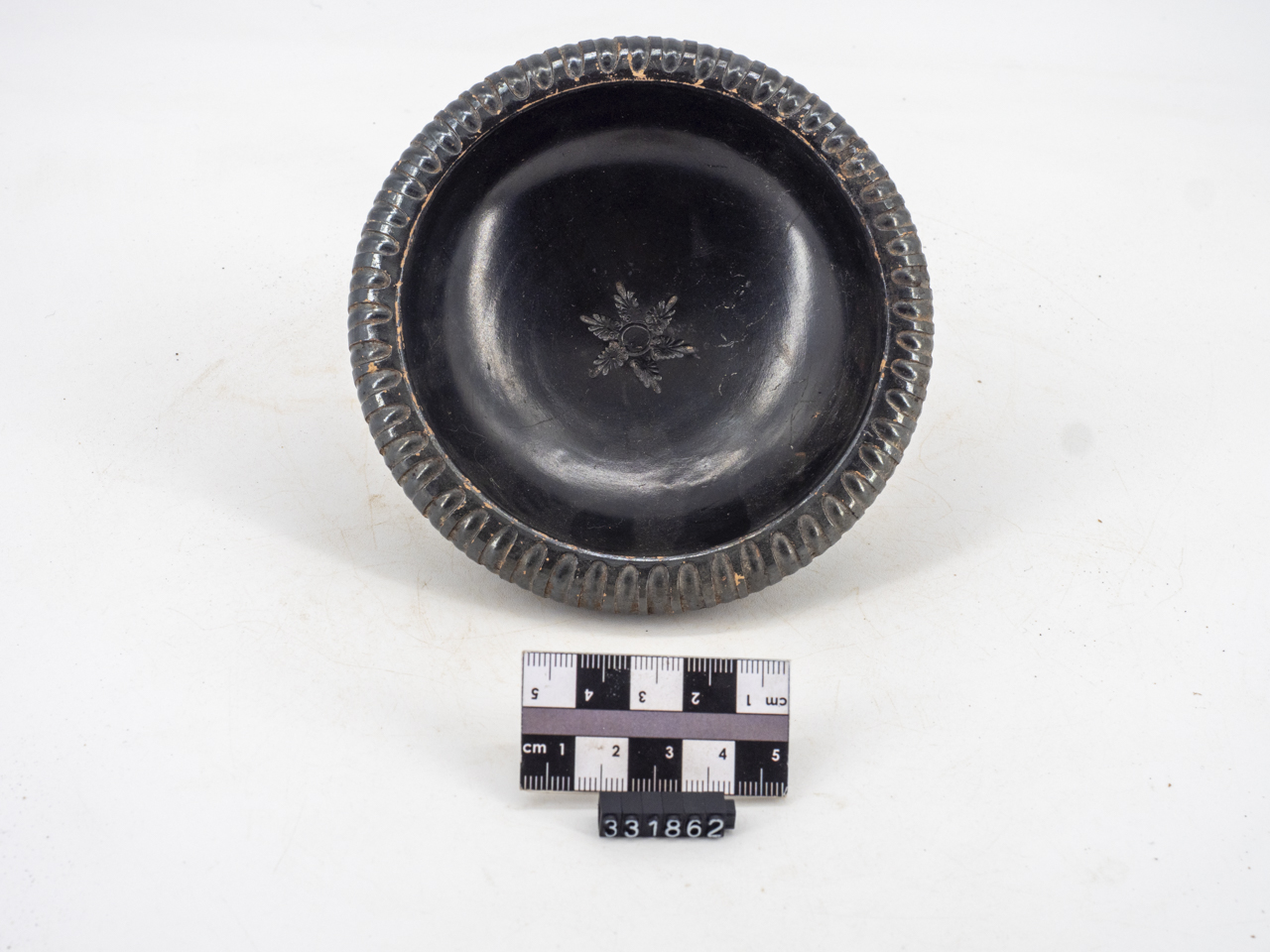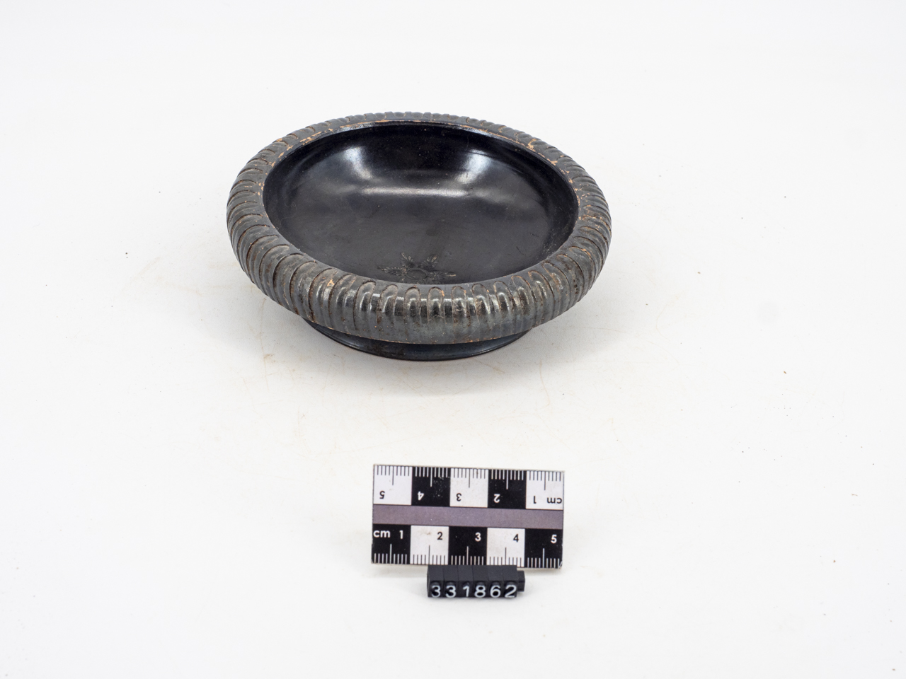 Orlo leggermente rientrante, distinto internamente. Vasca poco profonda, a profilo esterno concavo-convesso, con costolature sull'orlo e risega alla base della parte convessa. Piede leggermente svasato