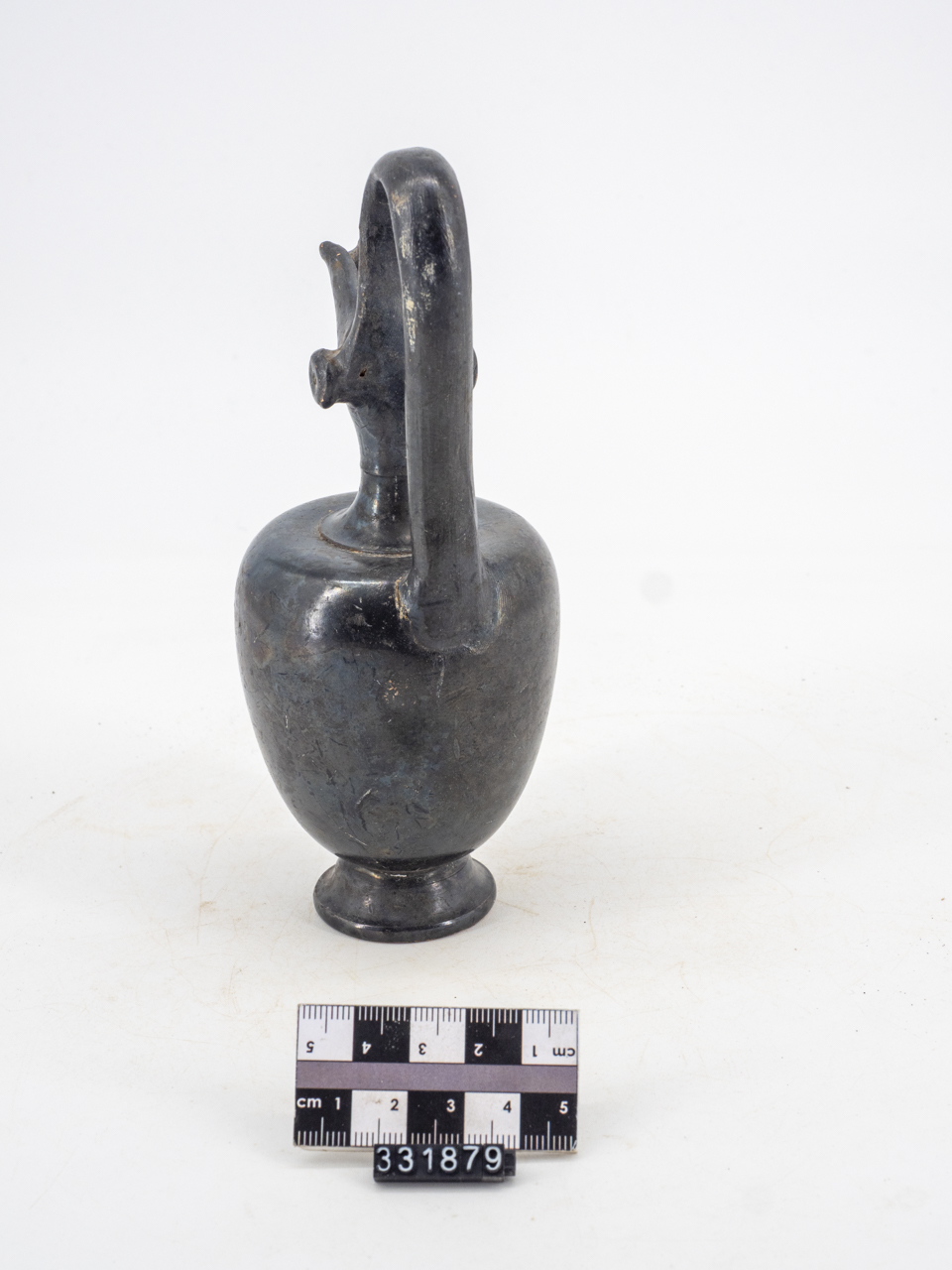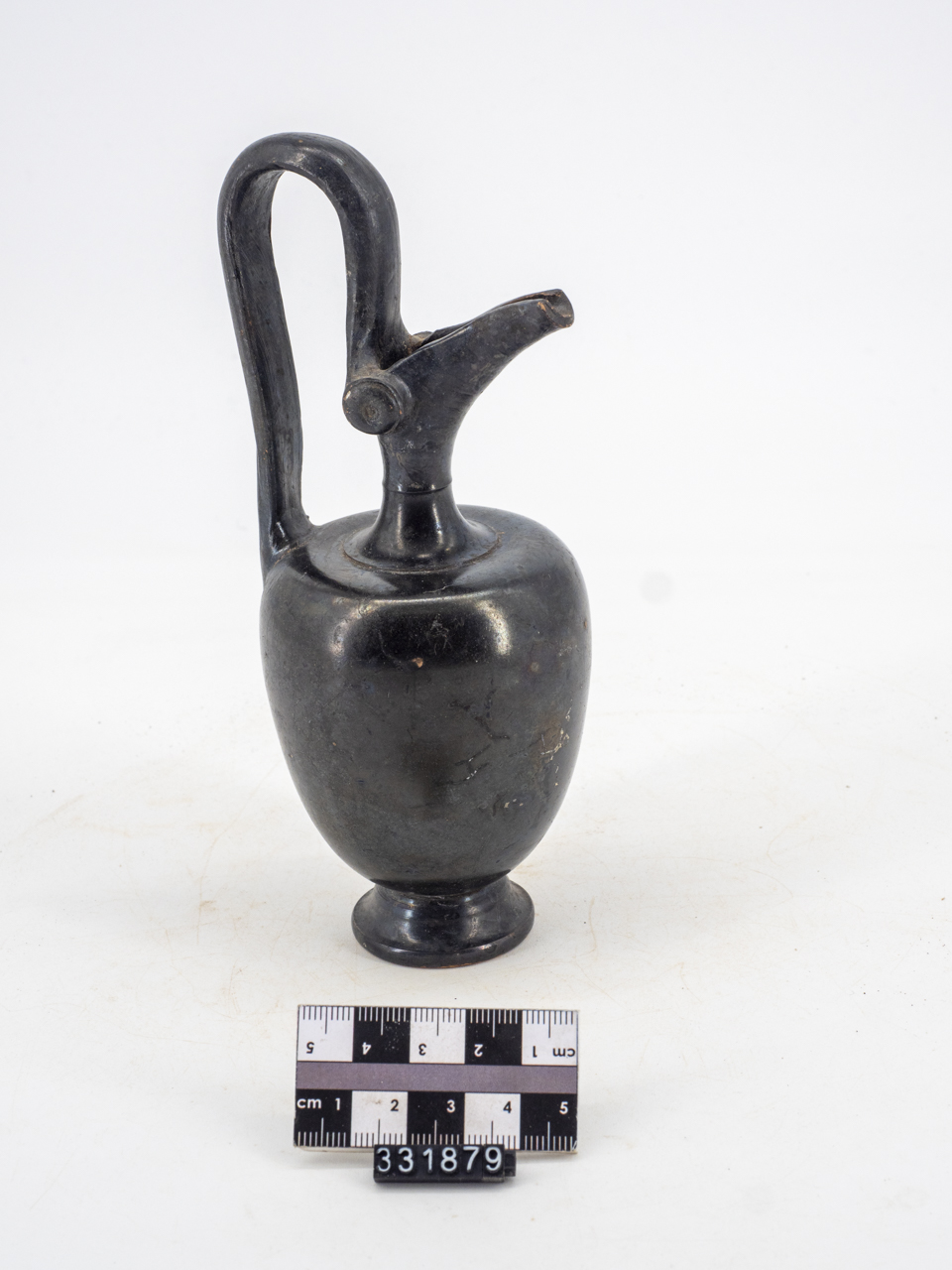 Orlo con lungo beccuccio obliquo e rotelle plastiche ai lati. Stretto collo cilindrico distinto da una risega. Corpo ovoidale con spalla schiacciata. Piede svasato e modanato. Ansa a nastro sormontante impostata su orlo e spalla