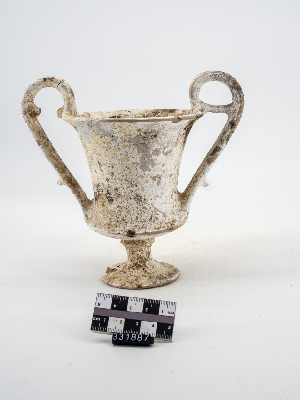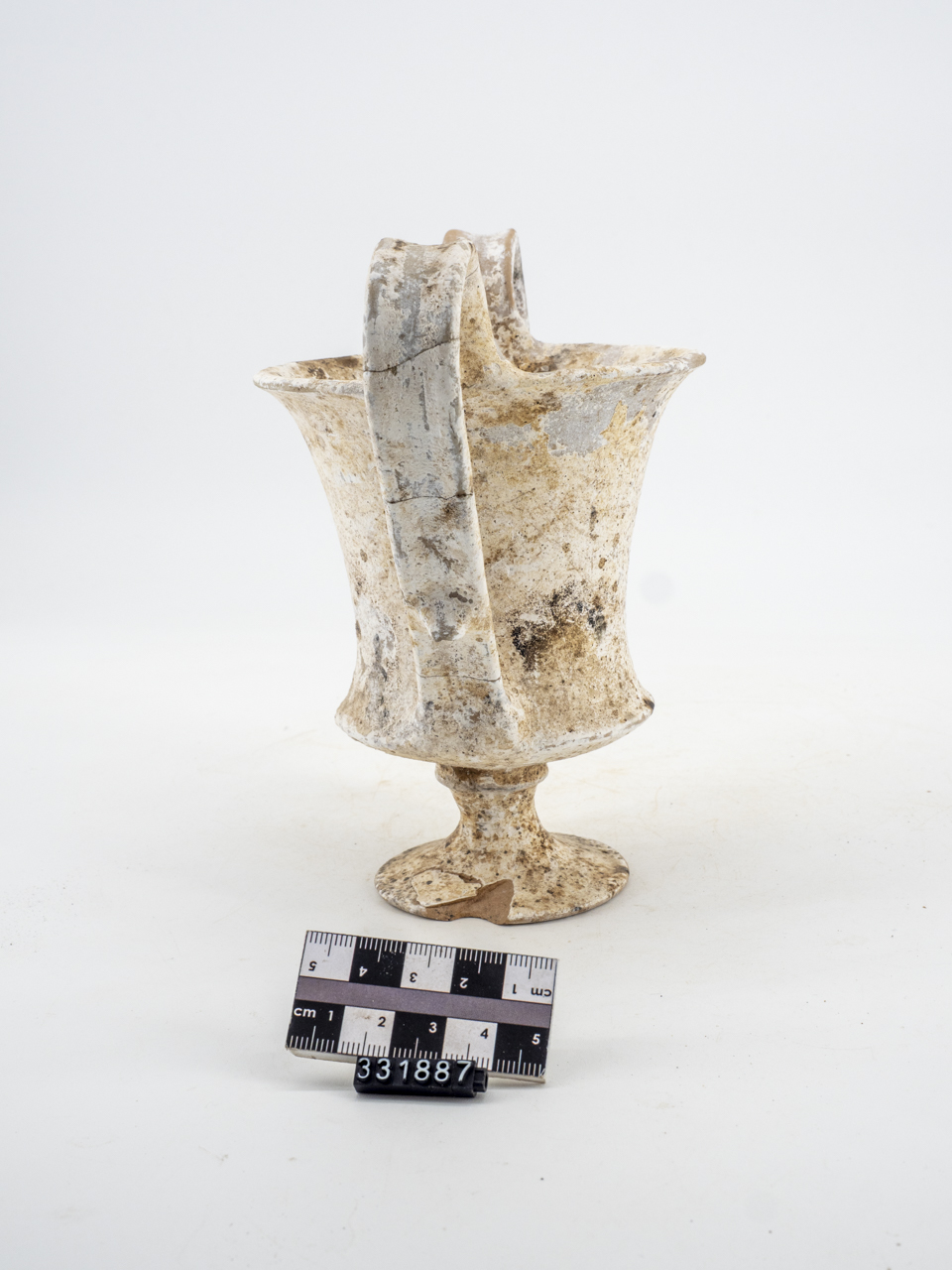 Orlo svasato con labbro estroflesso. Corpo cilindrico con risega per definire la vasca, impostato su alto piede a stelo modanato e base a disco. Anse sormontanti, impostate sull'orlo e in corrispondenza del fondo del vaso