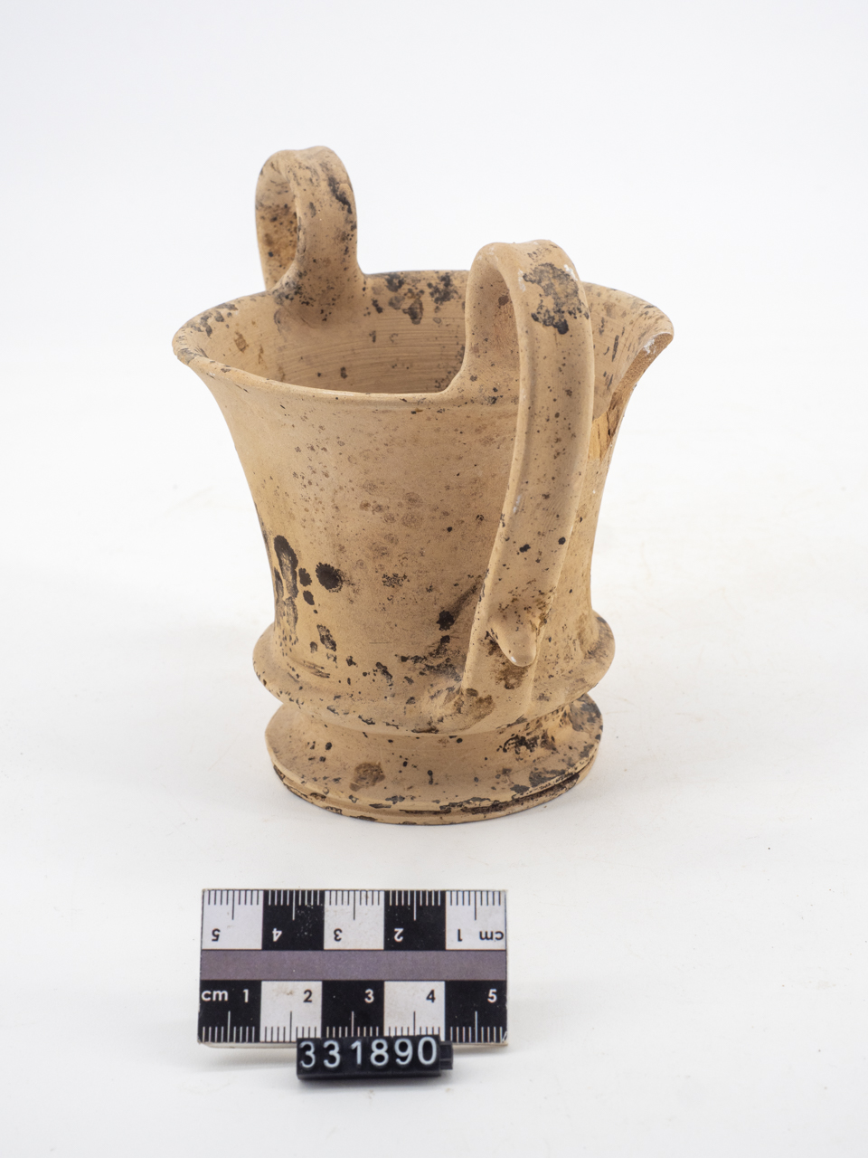 Piccolo kantharos con orlo estroflesso su basso corpo cilindrico con risega a definire la vasca. Basso e largo piede modanato. Anse a nastro sormontanti con apici, impostate sull'orlo e in corrispondenza del fondo del vaso
