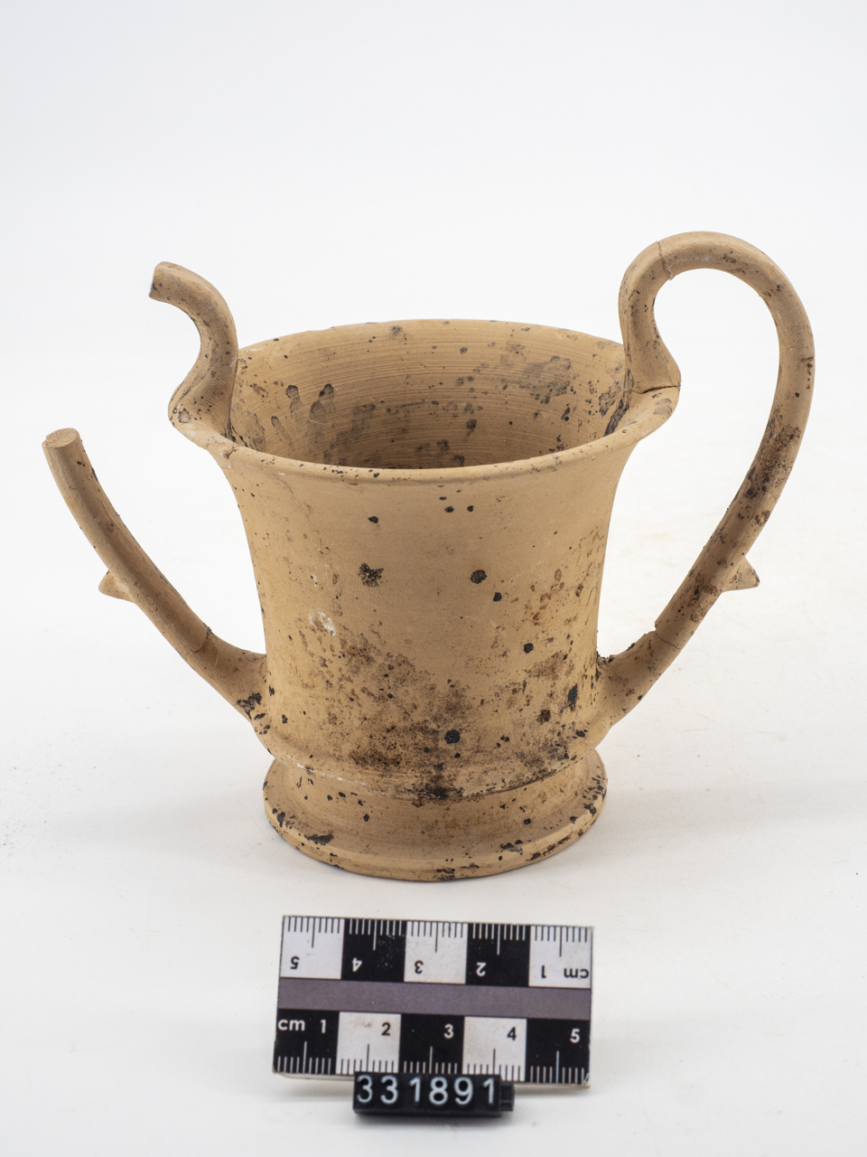 Piccolo kantharos con orlo estroflesso su basso corpo cilindrico con risega a definire la vasca. Basso e largo piede modanato. Anse a nastro sormontanti con apici, impostate sull'orlo e in corrispondenza del fondo del vaso