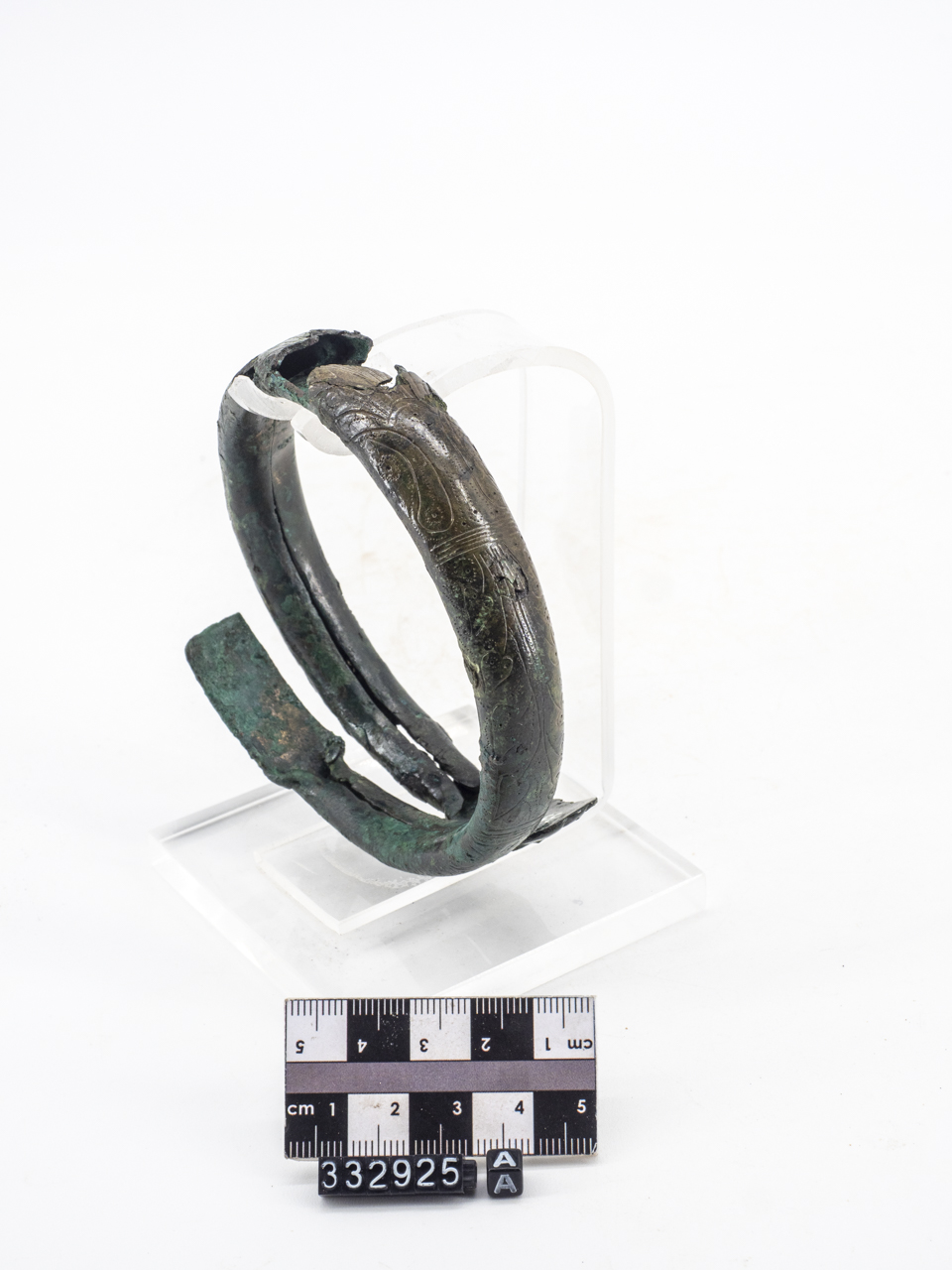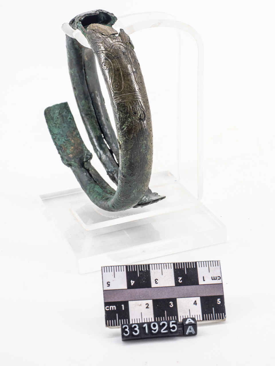 Bracciale femminile in bronzo formato da una lamina ripiegata e poi schiacciata, con massima espansione al centro, in modo da sovrapporre le estremità appiattite