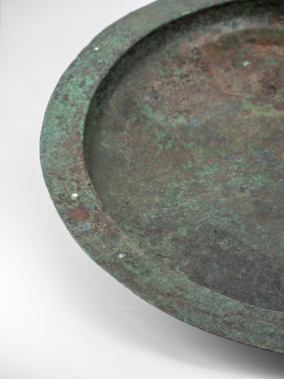 Orlo estroflesso e superiormente appiattito, distinto dalla vasca emisferica poco profonda. Sull'orlo si notano due fori, probabilmente funzionali all'attacco di un eventuale gancio. Base piana