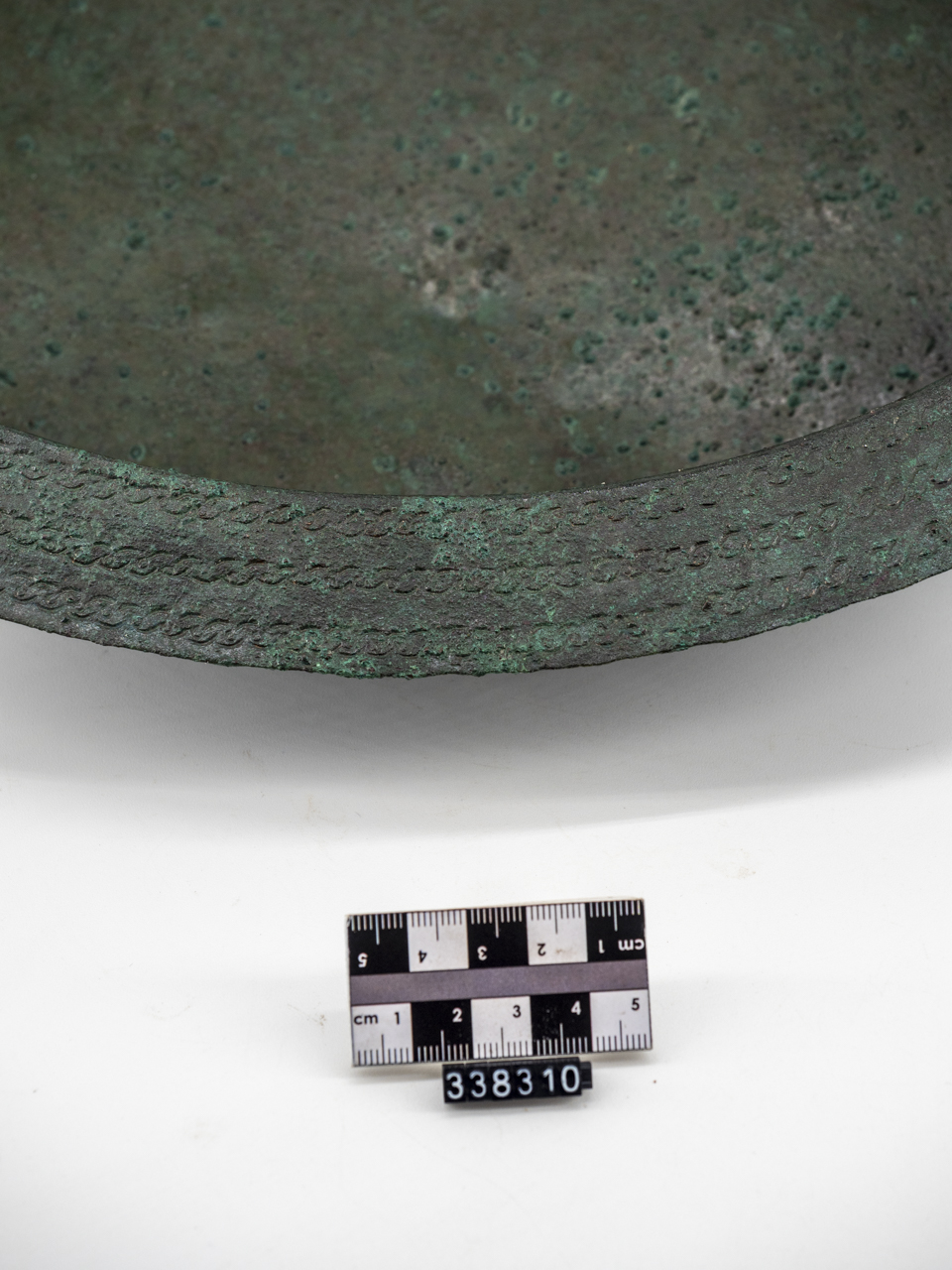 Orlo estroflesso e superiormente appiattito, distinto dalla vasca emisferica poco profonda. Base piana. Sull'orlo si notano due forni funzionali all'applicazione di placchette per gancio