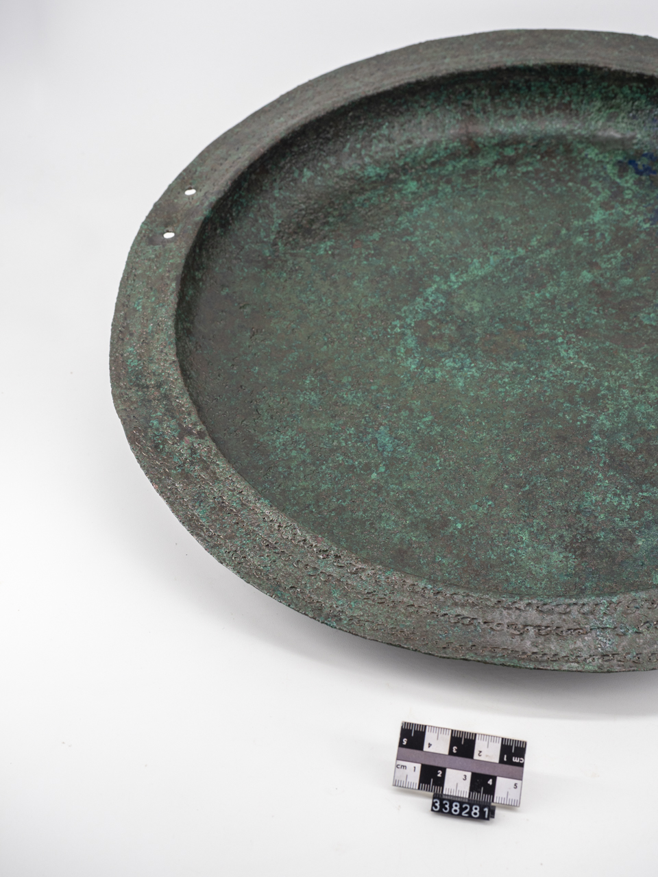 Orlo estroflesso e superiormente appiattito, distinto dalla vasca emisferica poco profonda. Base piana. Sull'orlo si notano due forni funzionali all'applicazione di placchette per gancio