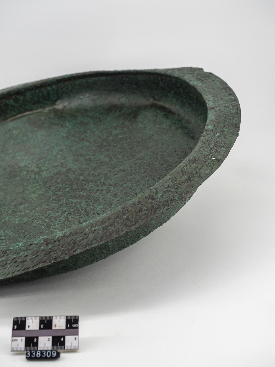Orlo estroflesso e superiormente appiattito, distinto dalla vasca emisferica poco profonda. Base piana. Sull'orlo si notano due forni funzionali all'applicazione di placchette per gancio