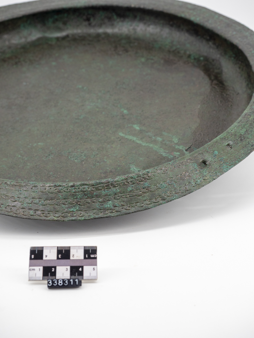 Orlo estroflesso e superiormente appiattito, distinto dalla vasca emisferica poco profonda. Base piana. Sull'orlo si notano due forni funzionali all'applicazione di placchette per gancio