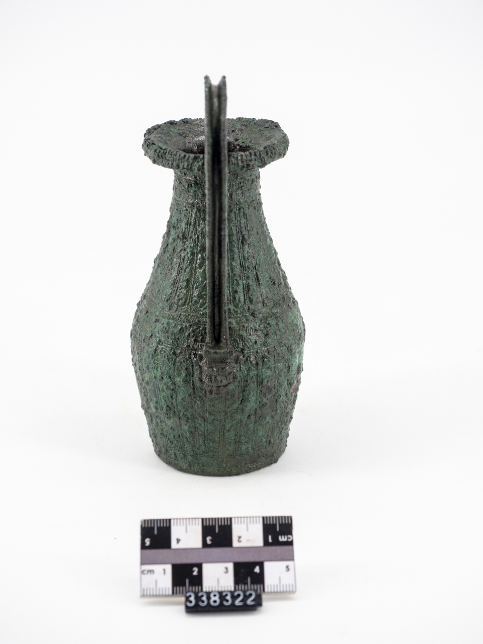 Orlo estroflesso su breve collo cilindrico. Corpo ovoidale e base piana. Ansa sormontante impostata sull'orlo e sulla pancia del vaso
