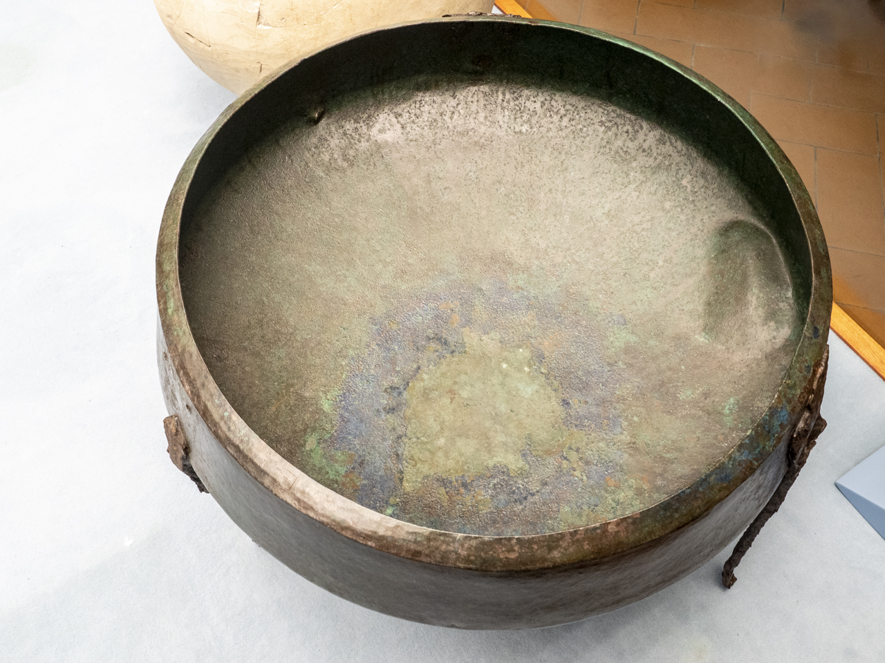 Orlo rientrante e superiormente appiattito. Ampia e profonda vasca e base piana. Piedi applicati attraverso chiodi, alla parete esterna del vaso