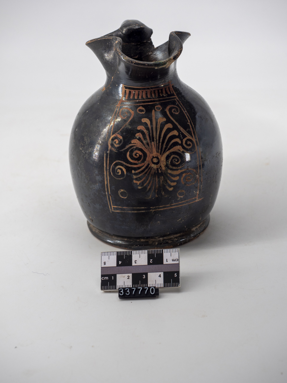 Oinochoe a bocca trilobata con orlo estroflesso su corto collo. Corpo ovoidale e piede ad anello. Ansa non sormontante impostata sull’orlo e sulla spalla