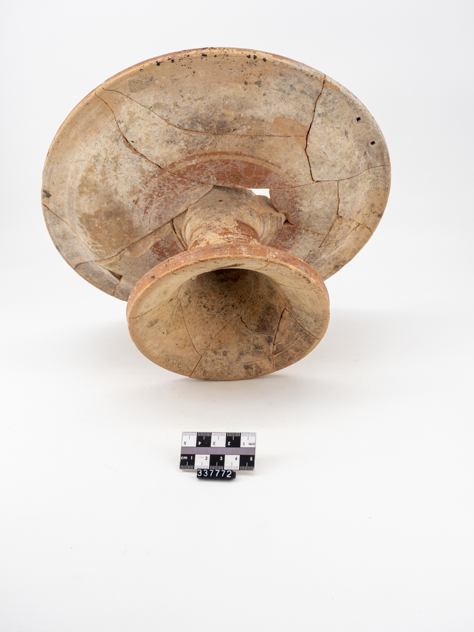 Orlo orizzontale con due scanalature nella parte superiore. Vasca troncoconica poco profonda, quasi orizzontale. Gambo cilindrico, piede sagomato con larga base di appoggio