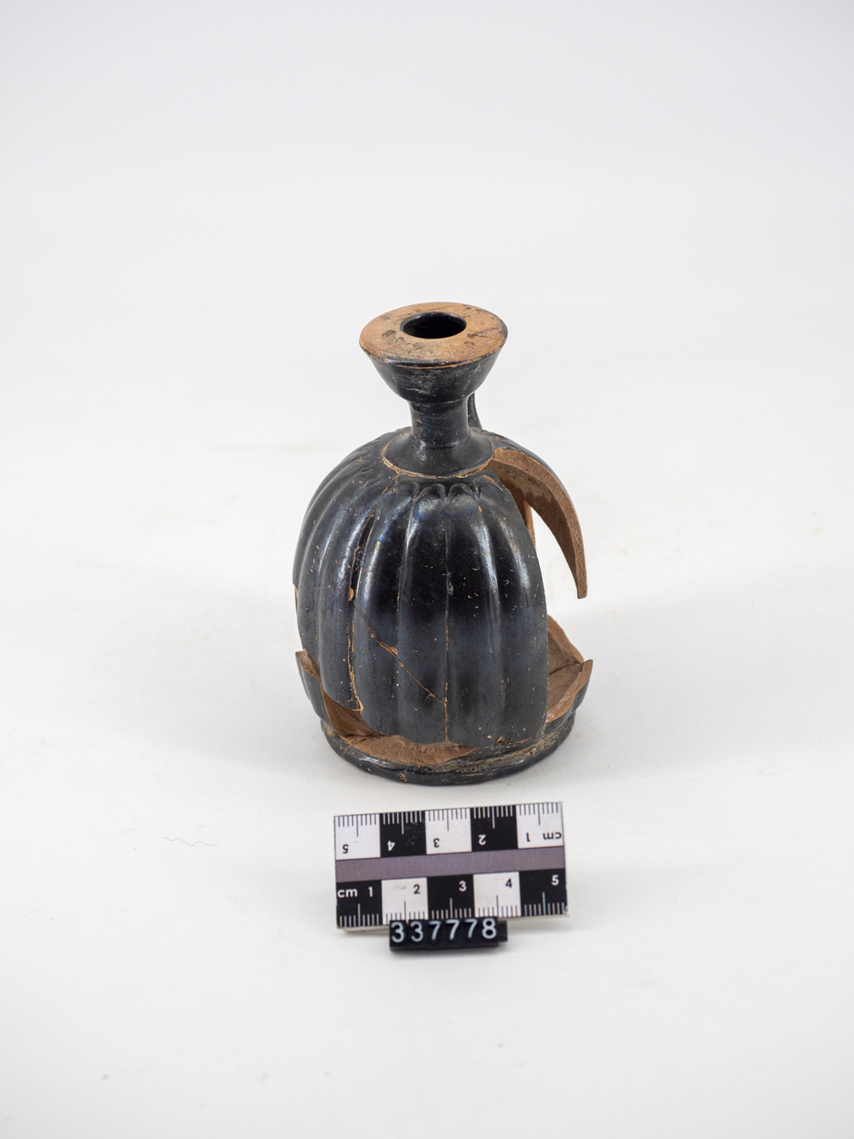 Piccola lekythos a vernice nera. Bocchello campanulato. Collo stretto e cilindrico su corpo ovoidale baccellato. Piede a disco distinto da una risega. Ansa non sormontante impostata sul collo e sulla spalla