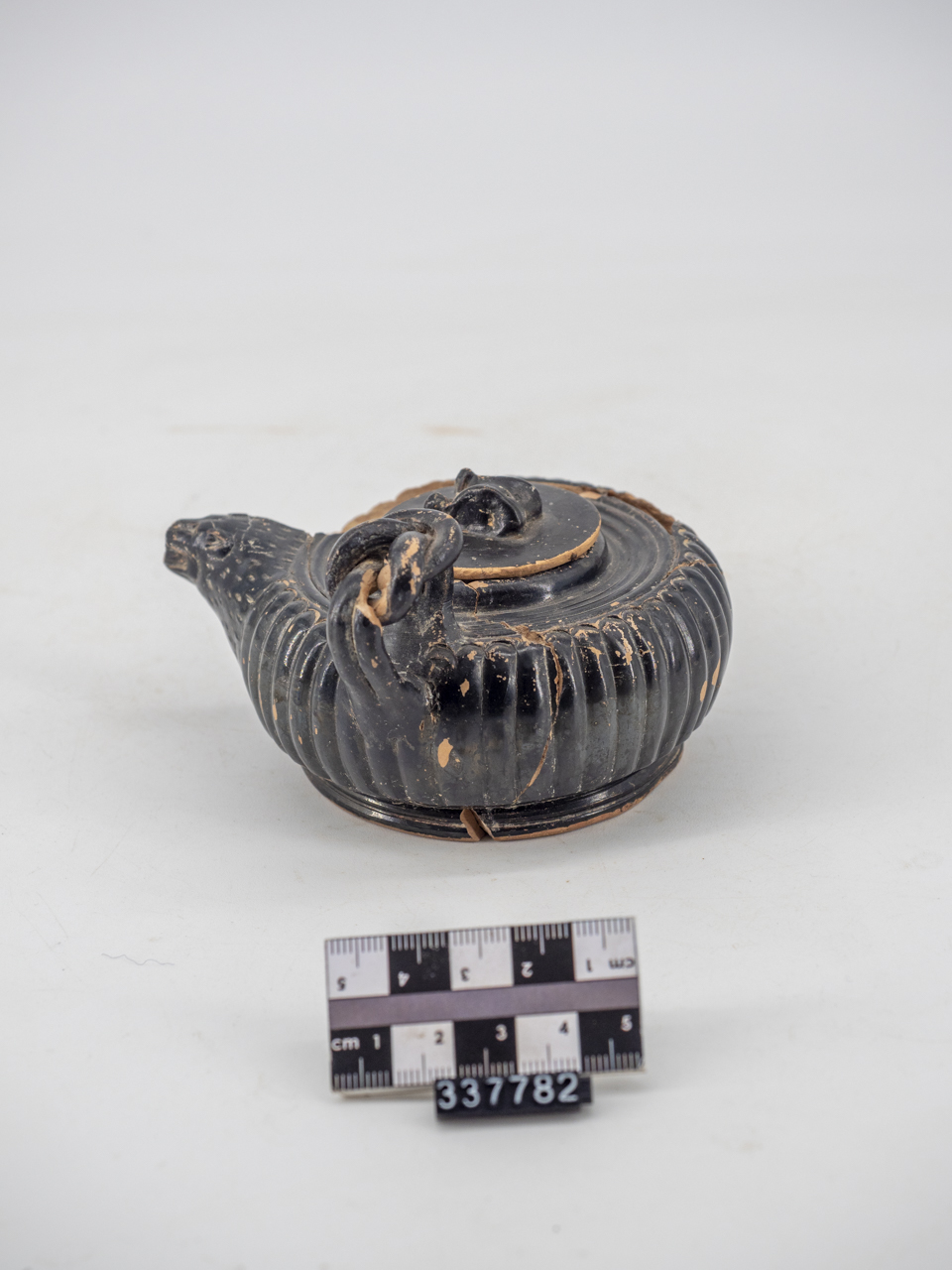 Corpo circolare schiacciato con baccellature verticali che si interrompono in corrispondenza del bocchello. Ansa sormontante e con motivo a nodo plastico. Basso piede ad anello modanato. Sulla spalla un coperchio che funge da medaglione centrale con decorazione a rilievo