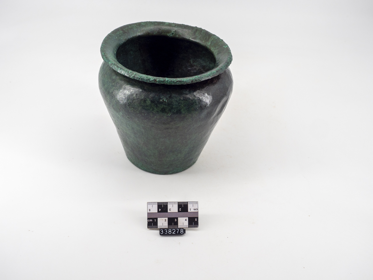 Piccolo stamnos in bronzo con orlo estroflesso su basso collo cilindrico. Corpo ovoide rastremato verso il basso e base piana