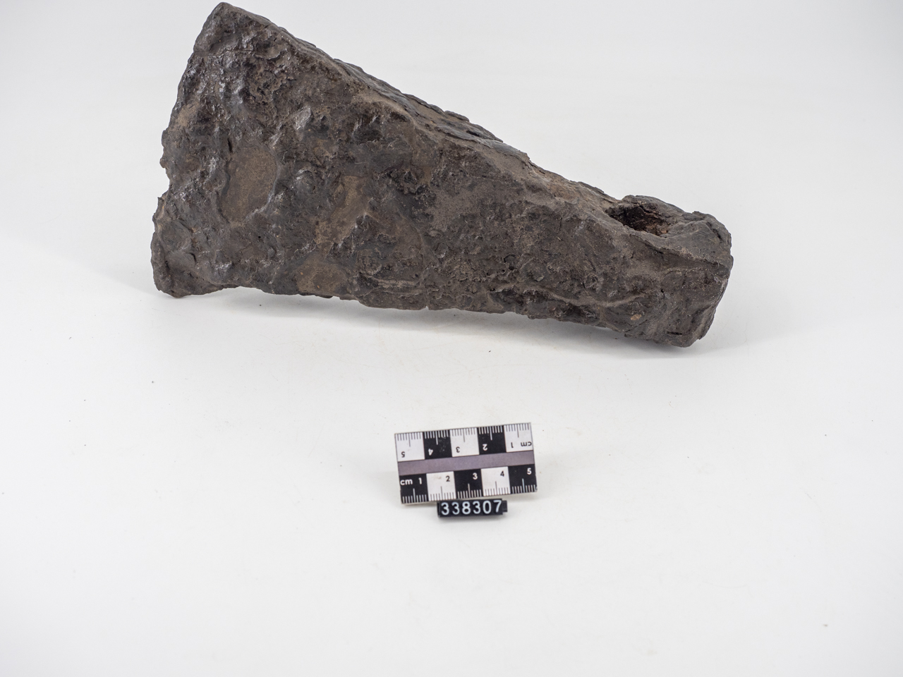 Testa di ascia in ferro mancante del manico. Forma trapezioidale con lato tagliente a profilo curvo