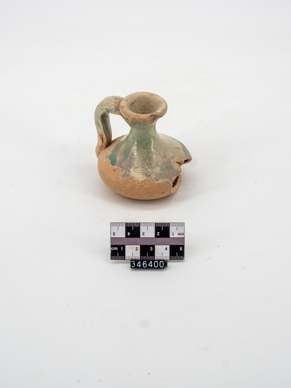 Lucerna a vasca circolare, spalla rientrante, collo svasato terminante con spesso orlo arrotondato, base piana; ansa a nastro verticale applicata sul punto di massima espansione del corpo e sul collo. Rivestimento vetroso coprente simile a smalto biancastro, steso in modo disomogeneo su ansa, orlo, collo e spalla. Diffuse sgocciolature di colore verde chiaro
