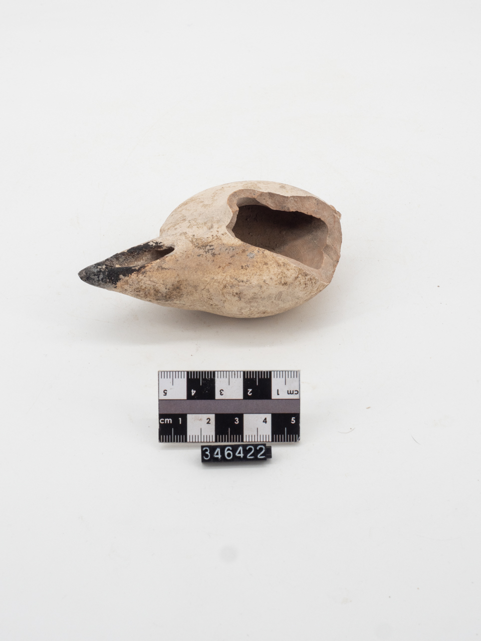 Lucerna a vasca circolare, spalla rientrante, becco ovoidale allungato, base piana; accenno di attacco di ansa applicata sul punto di massima espansione del corpo. Rivestimento vetroso coprente, biancastro, steso all'esterno del corpo ceramico e all'interno del becco. Ingobbio bianco