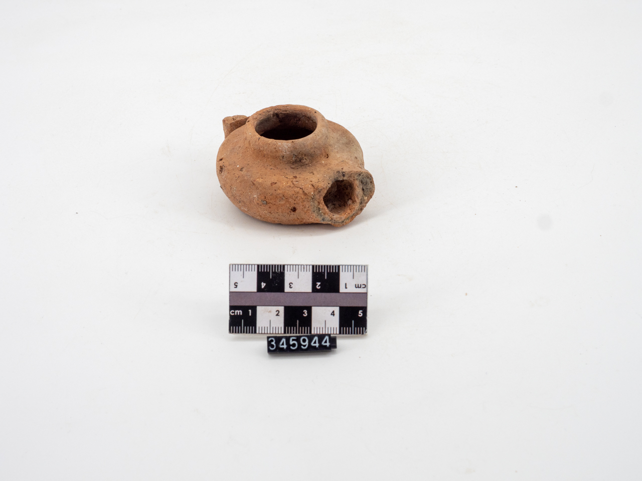 Lucerna acroma a vasca circolare dal profilo convesso, spalla rientrante, breve collo terminante con orlo assottigliato, base piana. Accenno di attacco di ansa verticale applicata sulla parte inferiore del corpo. Impasto refrattario