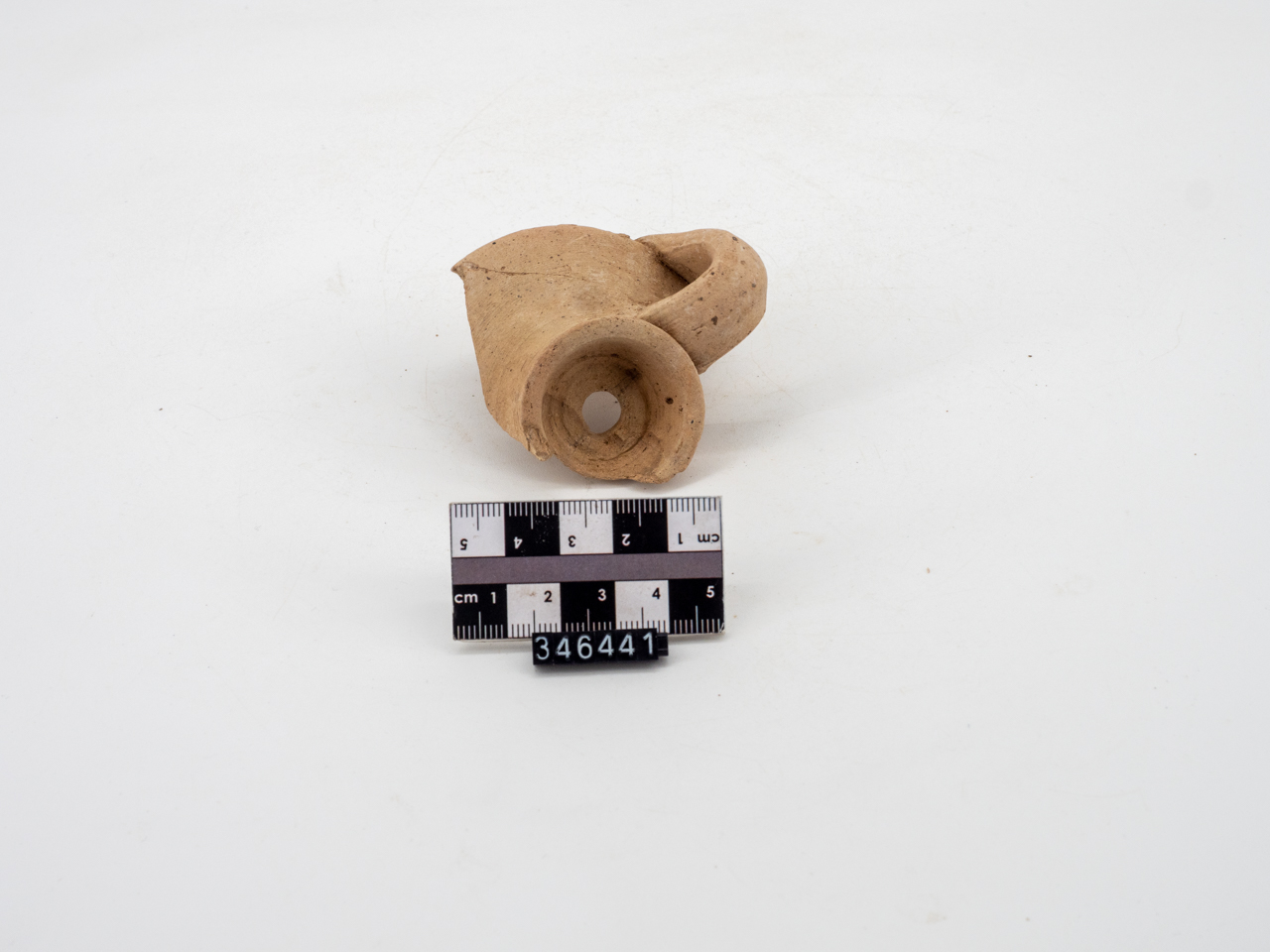 Frammento di lucerna acroma "a teiera", con orlo appiattito, leggermente estroflesso e vasca rientrante, dotata di foro centrale di sfiato. Ansa a nastro verticale applicata sul punto di massima espansione del corpo e poco sotto l'orlo. Superficie schiarita