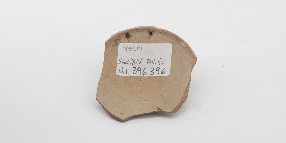 Fondo di piatto (o ciotola)umbonato. Ingobbio bianco e rivestimento vetroso trasparente all'interno. Decorazione graffita