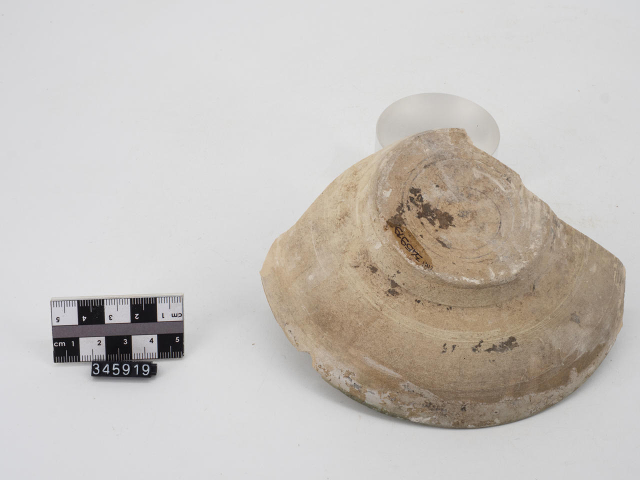 Ciotola con corpo dal profilo convesso, orlo indistinto, piede cilindrico e fondo leggermente umbonato. Rivestimento vetroso semi coprente, tipo "protomaiolica", steso sulla superficie interna del corpo ceramico, con sgocciolature all'esterno. Impasto beige