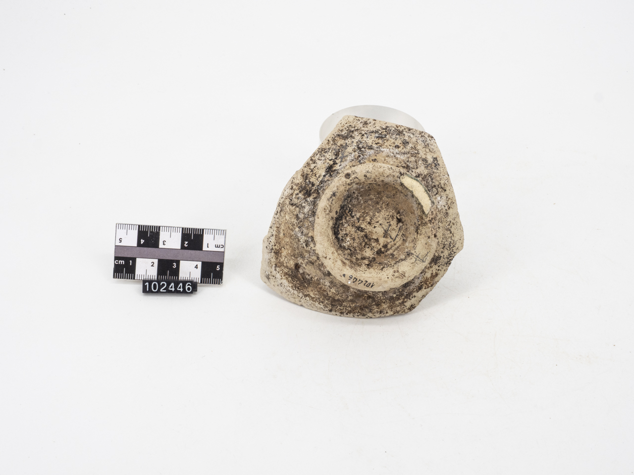 Fondo di ciotola (emisferica), con piede ad anello. Rivestimento vetroso semi coprente, tipo "protomaiolica", steso sulla superficie interna del corpo ceramico. Impasto beige
