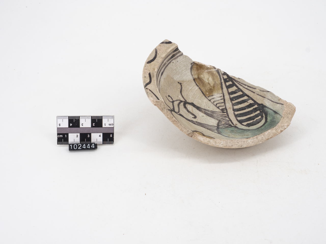 Ciotola emisferica, con orlo appiattito, leggermente introflesso, piede ad anello. Rivestimento vetroso semi coprente, tipo "protomaiolica", steso sulla superficie interna del corpo ceramico, con sgocciolature all'esterno. Superficie schiarita. Impasto beige