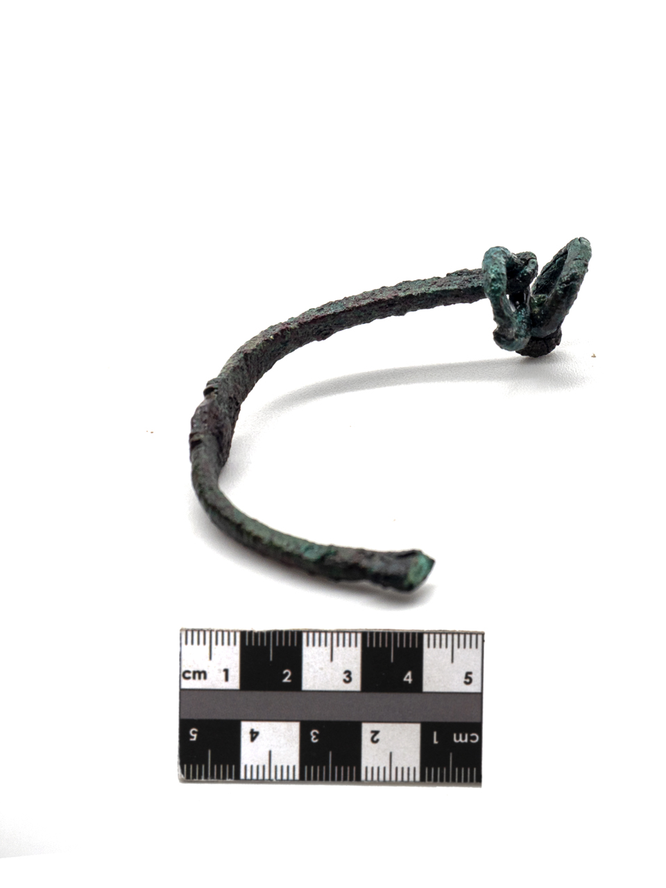 Maniglia ad arco con sezione tubolare, schiacciata nella parte mediana. Anelli rilevati a metà. a una estremità restano due anelli di aggancio