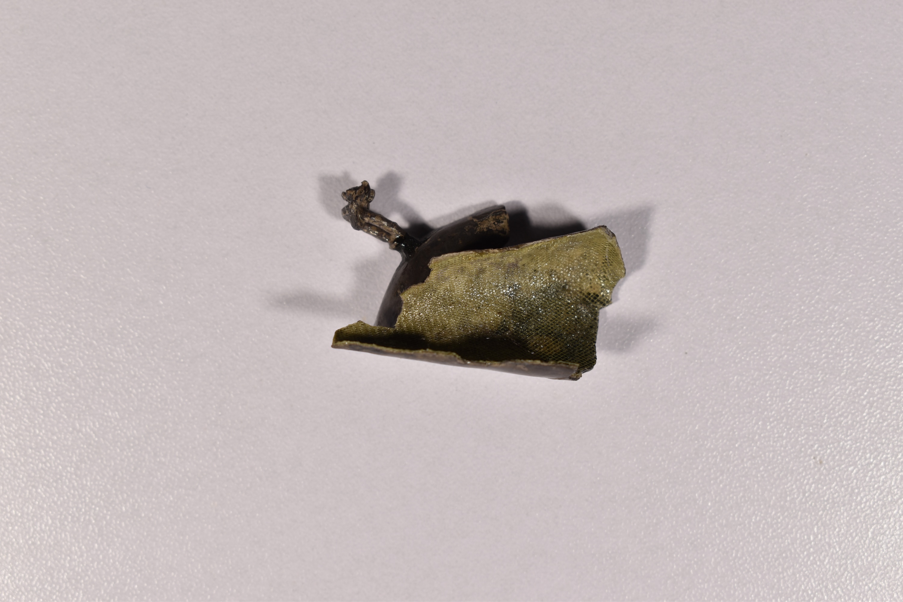 Pendaglio in argento di forma conica, cavo. Presenta resti di tessuto