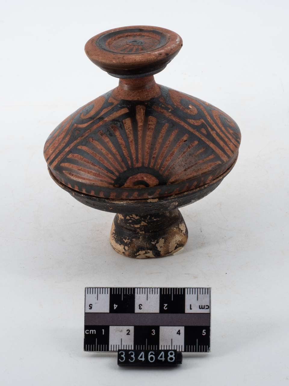 VASCA: labbro obliquo verso l'interno, vasca carenata, piede troncoconico modanato e raccordo cilindrico COPERCHIO: Labbro verticale leggermente rientrante, corpo a profilo convesso, pomello formato da uno stelo cilindrico unito a un elemento discoidale depresso con piccolo incavo centrale