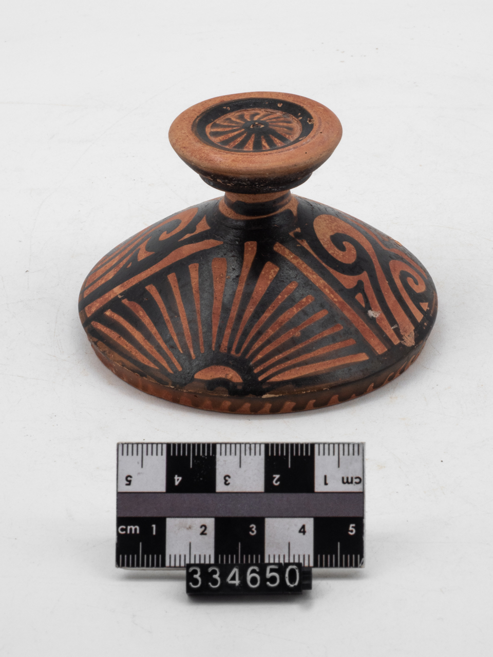 Labbro verticale leggermente rientrante, corpo a profilo convesso, pomello formato da uno stelo cilindrico unito ad un elemento discoidale depresso con piccolo incavo centrale