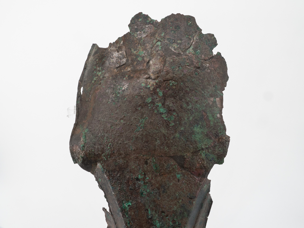 spessa lamina sagomata sulla forma della testa del cavallo nella sua parte anteriore plasmata come leggermente avvolgente. Sui lati alcuni fori erano deputati ad accogliere i lacci di fissaggio alla testa dell'animale. Superficie non decorata