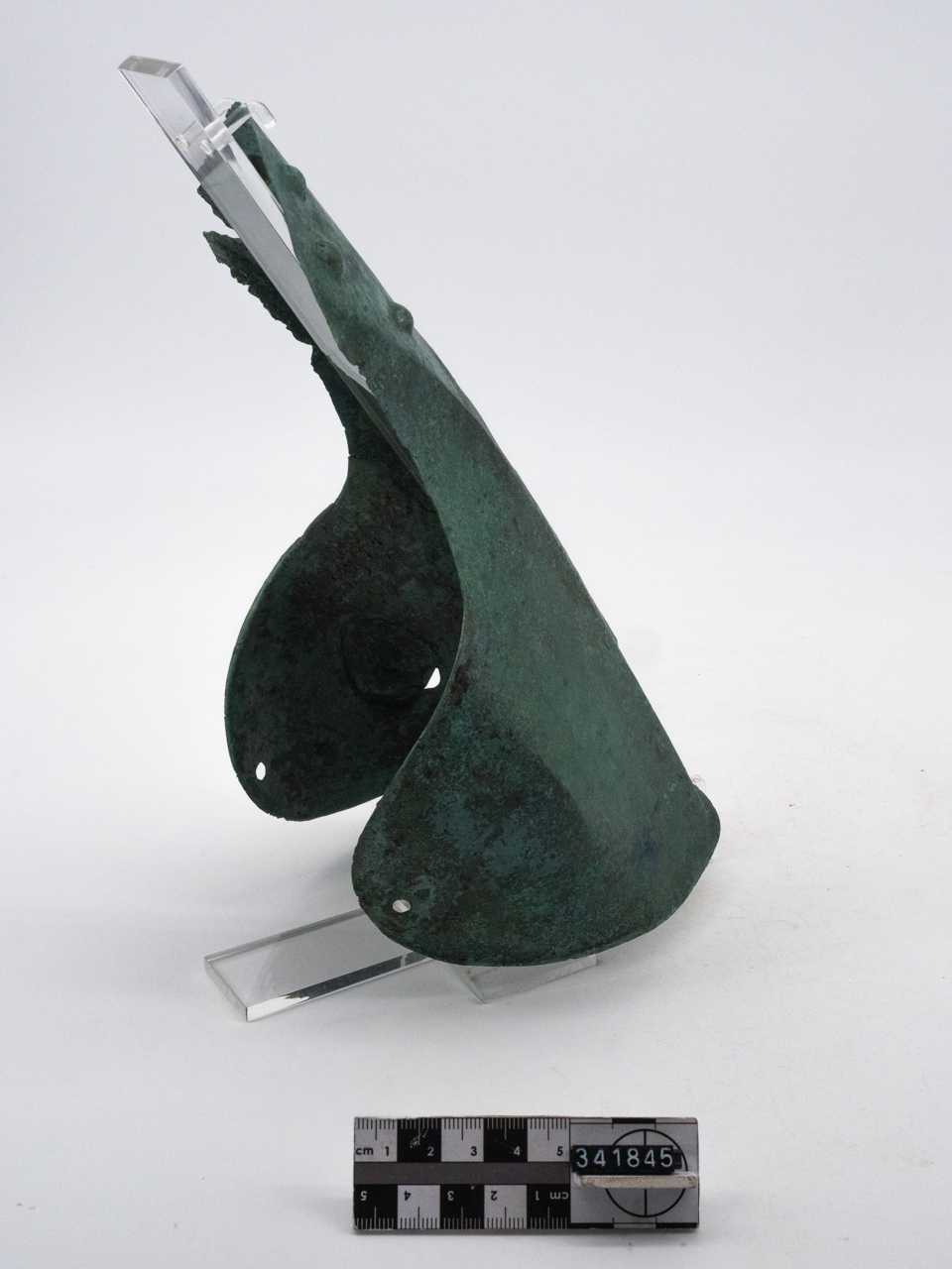 Anatomico, in lamina martellata, avvolgente alla gamba con protezione per il ginocchio. All'altezza del ginocchio rimane una decorazione a borchie. Si rilevano i fori per i lacci di legatura