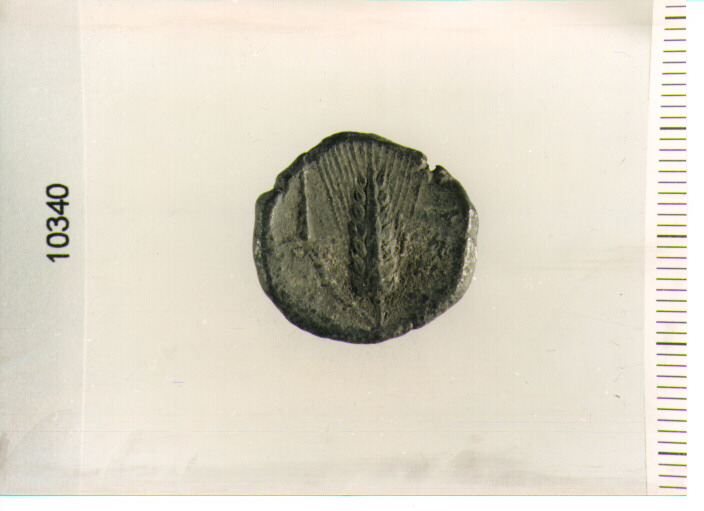 D/ TESTA DI LEUCIPPO CON ELMO CORINZIO A D.; A S. PROTOME LEONINA E LEGENDA; R/ SPIGA CON FOGLIA A S., SU CUI E' CLAVA; SOTTO, LEGENDA; A D. LEGENDA