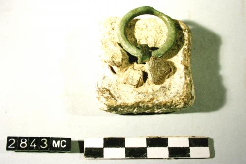 Blocchetto di fissaggio di forma quadrangolare, a lati lievemente concavi, cui è fissata centralmente una grappa bronzea, con inserito un anello fuso, regolare, in verga a sezione circolare, superficie irregolare