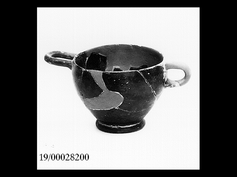 Corpo rastremato verso il fondo, piede ad anello sagomato a toro, anse poste sotto l'orlo, una orizzontale, l'altra verticale, interamente ricoperta di vernice nera brillante, ad eccezione dell'anello di appoggio e della superficie interna del piede, decorata da un cerchiello nero al centro