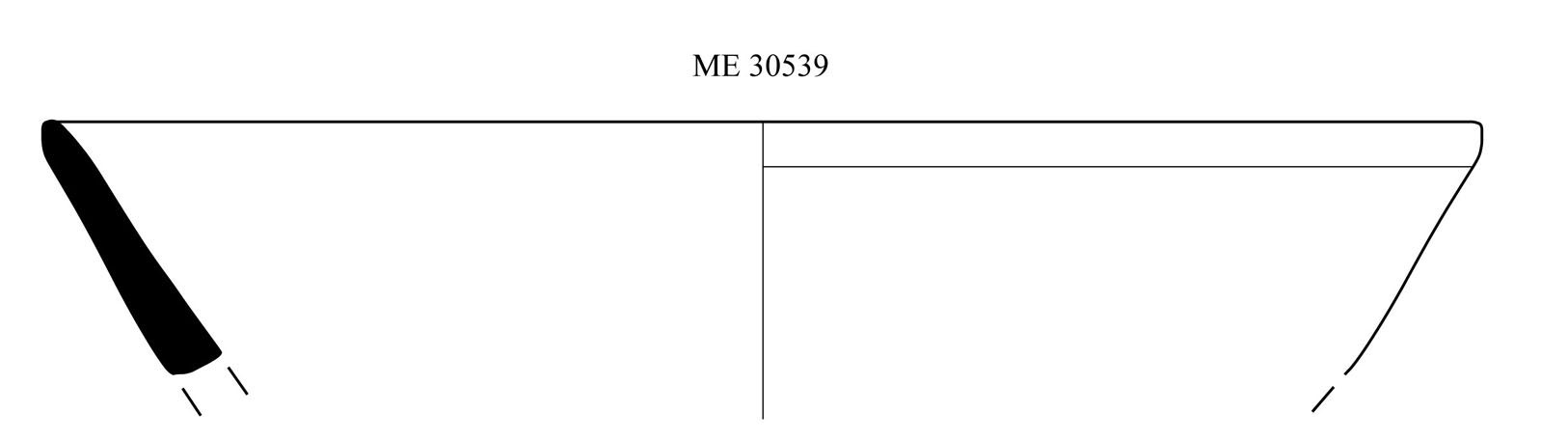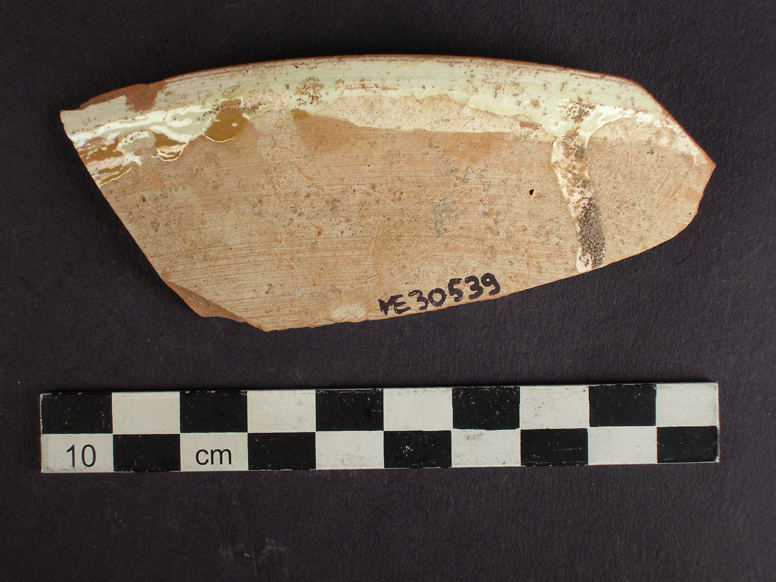 Orlo indistinto assottigliato e cavetto emisferico. Decorazione sotto l'orlo: pesce di profilo a sinistra, graffito a punta fine, motivo frequente nel repertorio del Free Style. CC arancio (5YR 5/6) con rari piccoli inclusi bianchi; ingobbio bianco, vetrina incolore lucente