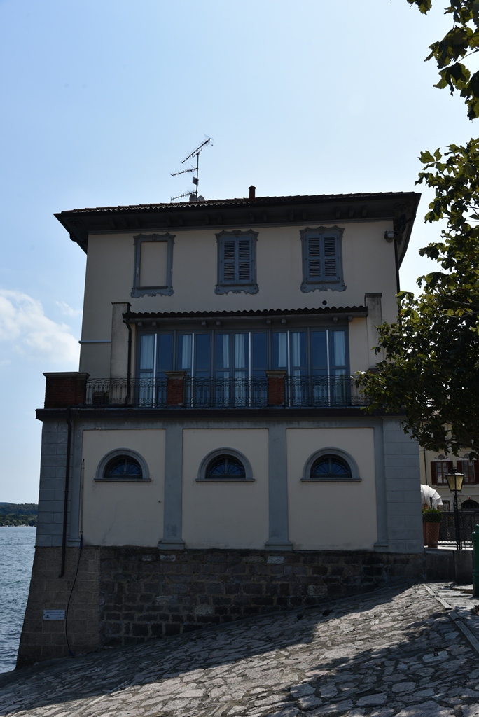La costruzione si innalza per tre piani ft. Su pianta rettangolare a manica doppia. Mentre il prospetto sul lago è privo di qualificazione formale, la facciata su p.za del Popolo è caratterizzata dal decoro barocchetto delle cornici a stucco delle finestre. Le due aperture centrali del primo piano sono affacciate su un lungo ed elegante balcone in sasso con ringhiere di ferro battuto. A piano terra l’ingresso quadrangolare al ristorante è inserito tra due colonne ottagone in sasso con base quadrata è capitello a grandi foglie stilizzate; le tracce d’arco rialzato hanno sviluppo parziale e non si concludono con altri sostegni