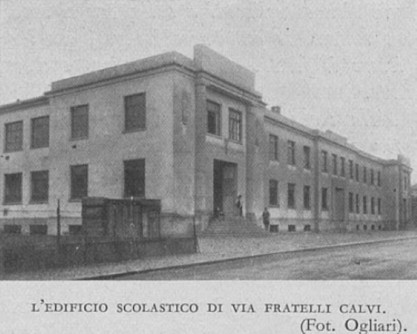 Edificio con pianta a C, tre piani fuori terra ed uno seminterrato. Su via Fratelli Calvi si trova il fronte principale, con due accessi posti alle estremità del prospetto. Gli ingressi sono monumentali: sono preceduti da una scalinata e inquadrati, insieme alla finestra del primo piano, da un ordine architettonico formato da semicolonne addossate alla parete che sostengono una architrave modanata