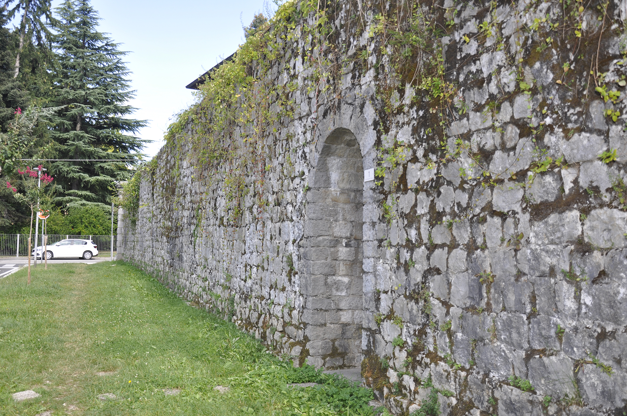 Tratto evidente della IV cerchia muraria di borgo San Pietro, all'angolo con via Marconi è impostato un pilastro bugnato a cui, su via Marconi, si connette e apre un portone. Questo tratto di mura urbiche ha andamento regolare con paramento in pietrame. Ai civici 3, 5, 7 si aprono tre portoni in pietra, a battuta interna, con arco a tutto sesto. Al civico numero 1, invece, si apre una porta ad arco a tutto sesto sempre con struttura in pietra