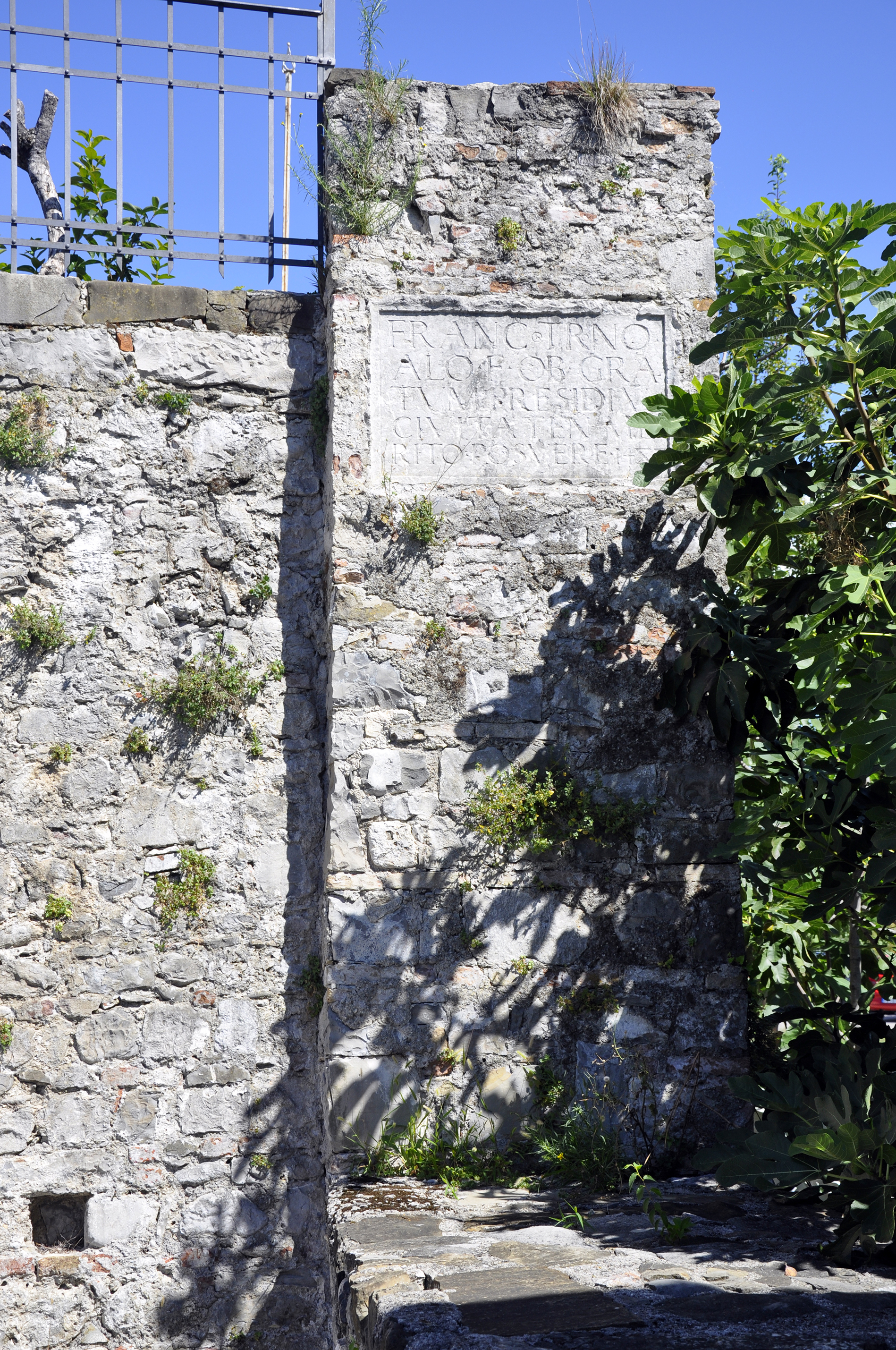 Tratto evidente della quarta cerchia di mura di Borgo Brossana di cui si è mantenuto il vallo con muro di controscarpa e fosso anteriore; il tratto termina con una torre nei pressi dell'antica porta urbica. Muraglia ad andamento irregolare con paramento in pietrame, alta circa 4 metri, con muro di controscarpa alto circa 1,5 metri, in grossi ciottoli. La casa al mapp. 203 si appoggia al muro, proseguendo all'interno sul mapp. 2020, tra i due mappali si apre un portone di circa tre metri di larghezza per tre di altezza, con spalle in mattoni, architrave in c.a., alleggerito verso l'interno da una voltina a sesto ribassato in mattoni. La torre rettangolare che conclude la tratta è costituita da grandi ciottoli a corsi regolari, con pietre squadrate agli angoli, con l'angolo esterno sbrecciato. Lungo via Borgo Brossana, davanti al ponte sul rio Emiliano la torre ha una specie di lesena sporgente, con una lapide e con un muro basso avanzato, di spessore un metro; il lato della torre verso il borgo presenta un gradone con abbassamento di quota e termina con grosse pietre squadrate