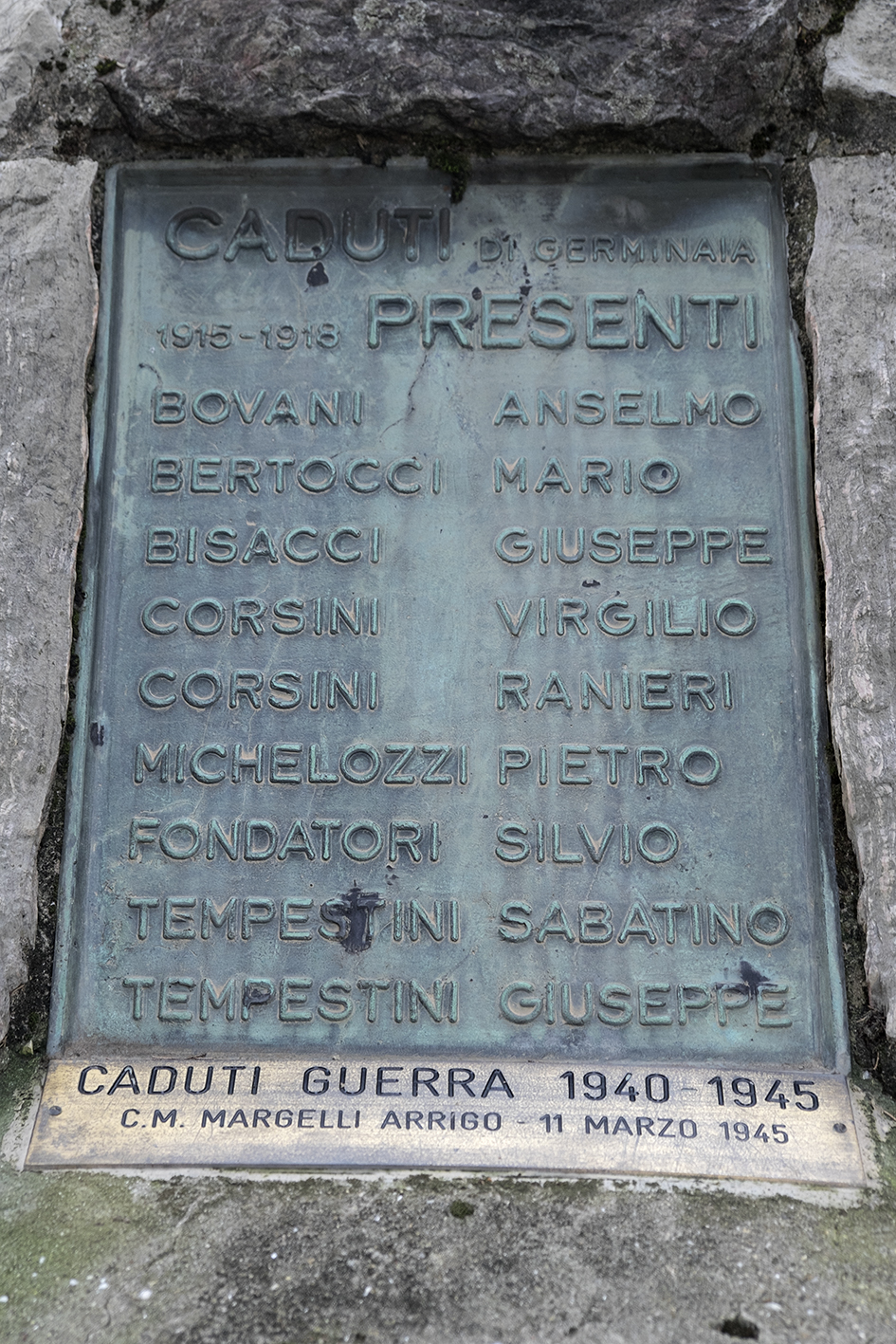 L'area antistante l'ingresso del cimitero presenta piante di cipresso disposte in filari che, probabilmente, almeno in parte, costituivano un parco della Rimembranza, ma sui quali non rimangono i nomi dei caduti. I due filari sulla destra circondano il monumento ai Caduti di Germinaia, costituito da una base sormontata da una piramide. Nella parte superiore è presente una lastra recante i nomi dei caduti della prima guerra mondiale e, al di sotto, un’altra piccola targa con il nome di un caduto della seconda