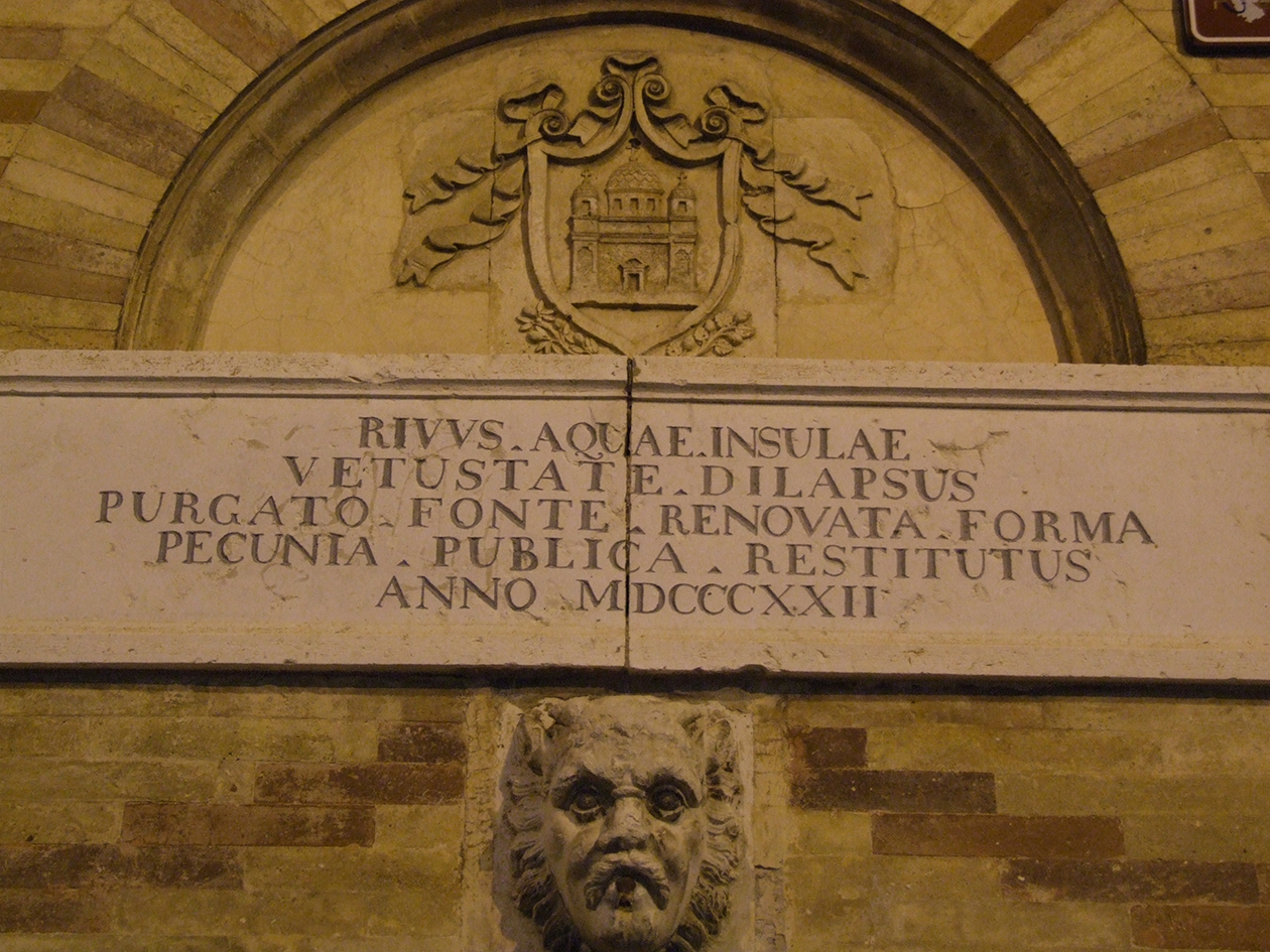 La `fonte` consiste in una parete in muratura di mattoni con cornice aggettante di coronamento e vasca semicircolare alla base; è addossata al muro esterno della sacrestia della Chiesa di S. Maria della Misericordia