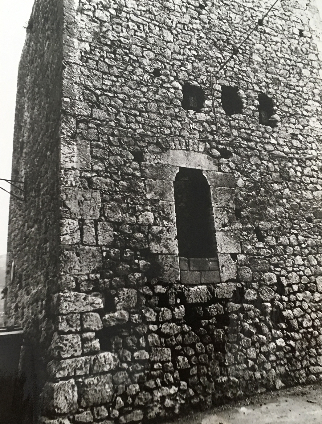 Torre quadrangolare con finestrelle rettangolari, con architravi su mensole e soprastante arco di scarico