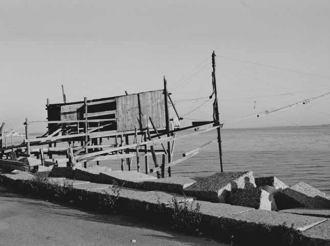 La costruzione è in ferro e pali di legno infissi nella sabbia o nella roccia, la seconda parte dei pilastri, quella da giuntare al ferro, è costituita da travi di legname (di castagno o anche di altre specie come l'olmo e la quercia) come l'argano e le antenne. La cabina di servizio, la piattaforma, il camminamento delle passerelle è realizzato con l'abete ed il larice i cavi in fibra vegetale