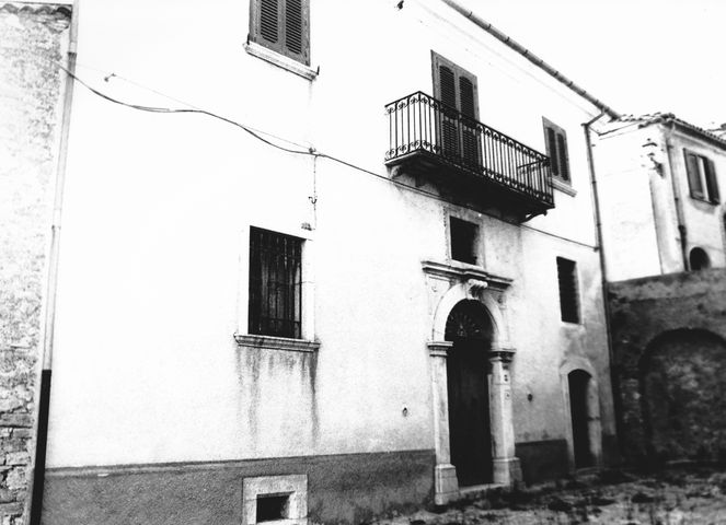 L’edificio è a pianta trapezoidale si sviluppa su tre livelli di piano, le pareti perimetrali sono in pietra intonacata. La copertura è del tipo a falde e manto in tegole di laterizio e cornicione lineare. Sulla facciata principale, caratterizzata da una composizione simmetrica, nell'asse mediano presenta il portale principale, in pietra, con arco a tutto sesto e concio di volta modanato inserito in una trabeazione, sormontato da un'apertura quadrata con grate in ferro e da un balcone con ringhiera in ferro; ai lati, poste simmetricamente, due aperture rettangolari con grate al primo livello e due finestre con soglie in pietra al secondo