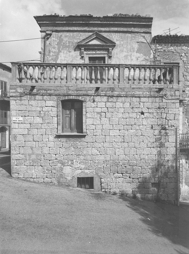 pianta ad L; muratura continua in pietra intonacata; struttura e forma degli orizzontamenti non accertabile; copertura a padiglione con manto di tegole marsigliesi; portale ad arco e bugne, finestre con cornicione e balcone con timpano triangolare, fregio dipinto lungo la fascia sottostante il cornicione e sopra le aperture. Infissi a persiana in legno. Il corpo laterale, piu' basso, e' delimitato da una balaustra di pilastrini in pietra. Nell'immobile tre unità abitative