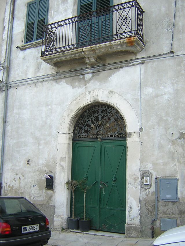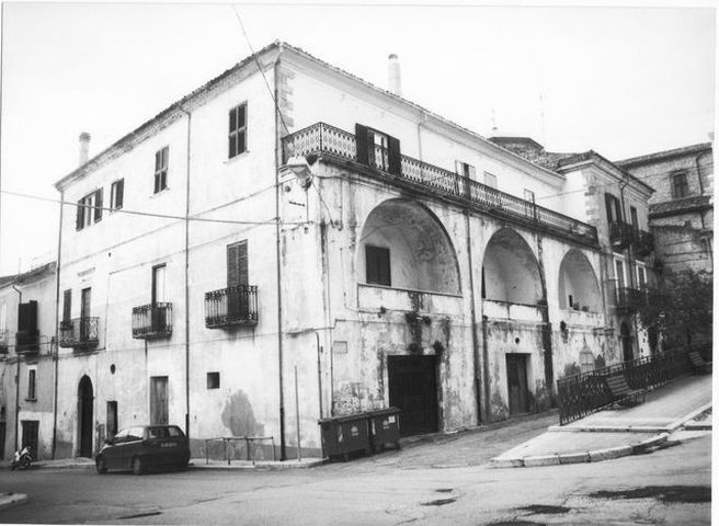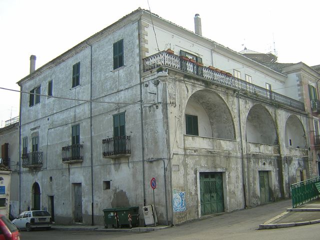 Edificio d'angolo a tre piani in muratura intonacata con tetto a padiglione; il primo piano del fronte laterale è caratterizzato da un loggiato con volte a botte; mentre il secondo piano presenta una terrazza continua. Sulla sinistra del fronte principale il portale ad arco in pietra, al primo livello una serie di tre balconi, sormontati al secondo livello da una serie di finestre. Nell'immobile undici unità abitative, sei locali deposito e tre rimesse