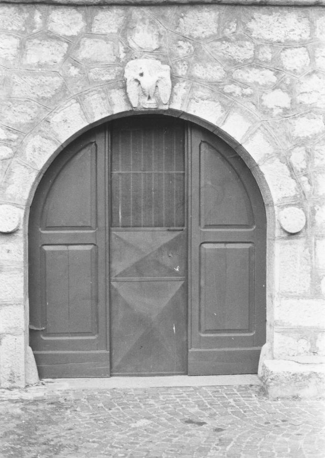Edificio d'angolo di forma ad L, aggregazione di due unità, a due livelli, di cui uno seminterrato, in muratura intonacata, a vista sul fronte Ovest. I solai sono con struttura in ferro e laterizi, la copertura a soletta è a due falde sul corpo Nord, ad una falda sul corpo Sud, con manto in tegole marsigliesi. Sul fronte Ovest conserva una finestra con cornici in pietra squadrata e davanzale in lastra modanata con al centro rilievo a motivo floreale ed una scultura raffigurante un'aquila sul concio di chiave dell'ampio portale ad arco a tutto sesto. Una scala addossata al fronte Sud da accesso alla porzione a Sud, integrazione successiva. Su fronte Nord un semplice portale e due finestre