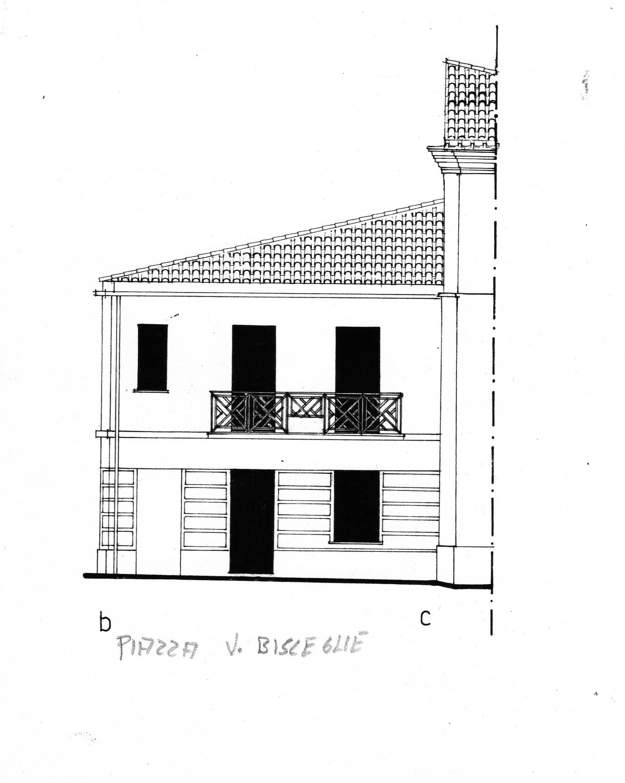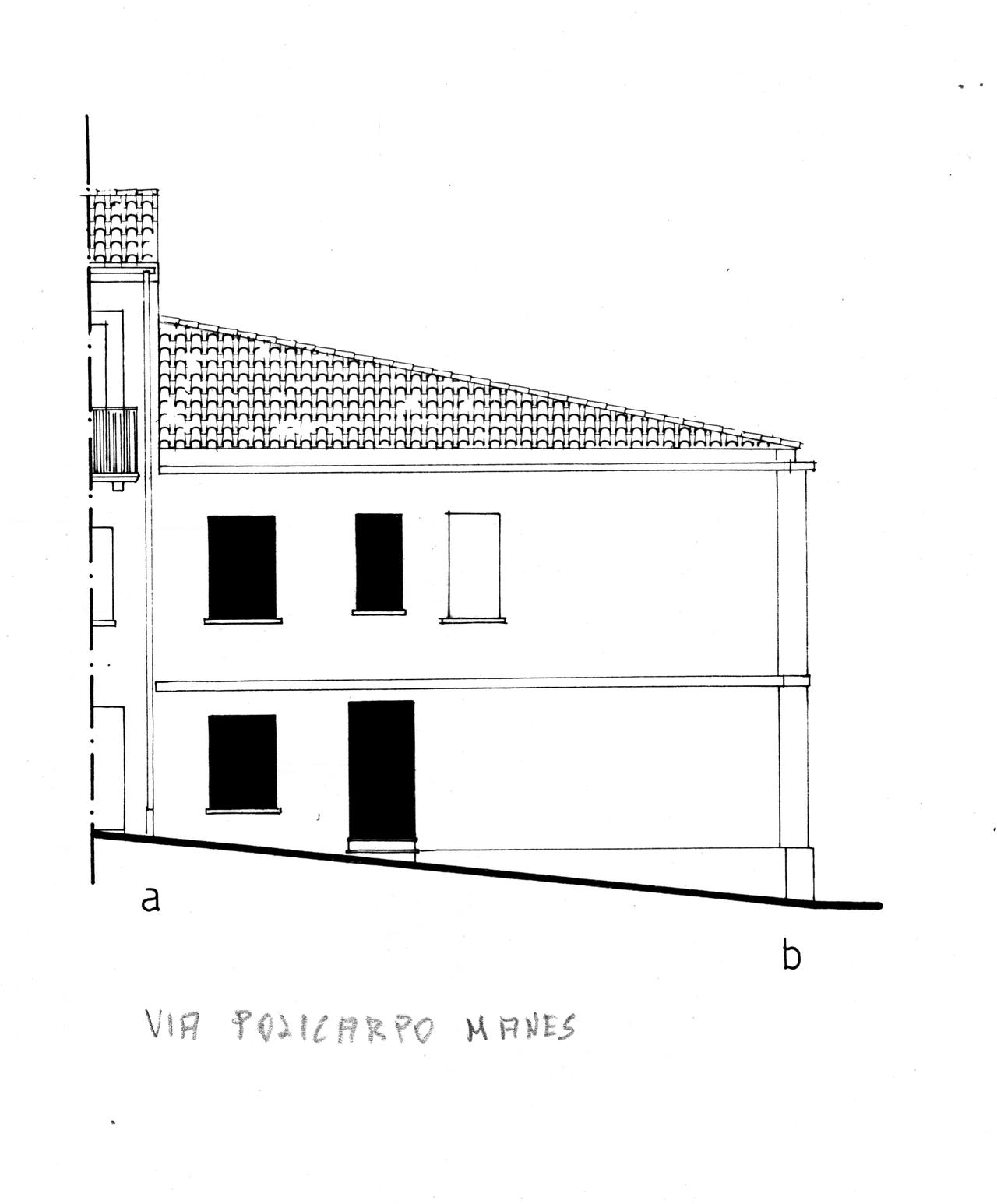 L'edificio in pianta trapezoidale si sviluppa su due livelli di piano; la muratura è mista ed è intonacata. La facciata principale presenta una tripartizione regolare di finestre. Il piano terra è scandito orizzontalmente da uno zoccolo e da fasce regolari di scanalature. Il primo piano presenta un balcone decentrato. La facciata su Via Manes presenta uno zoccolo di base e fasce marcapiano
